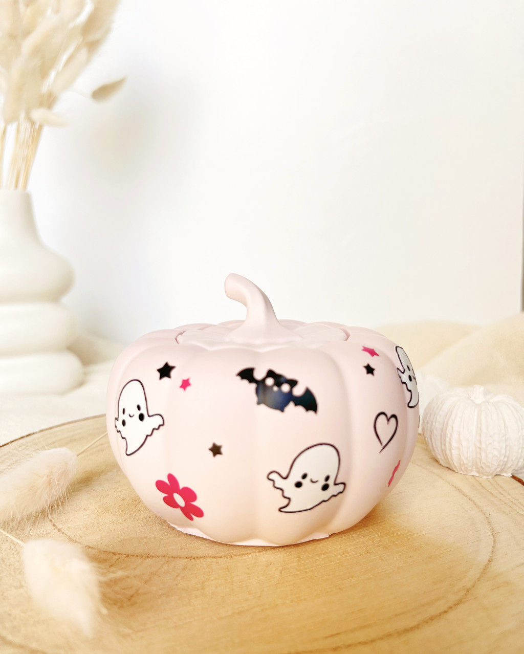 Ez a pasztell rózsaszín tök mécsestartó a Halloween vidám oldalát hozza el otthonodba. A kedves kis szellemek, csillagok és virágminták játékossá teszik, ezzel cuki hangulatot teremtve.